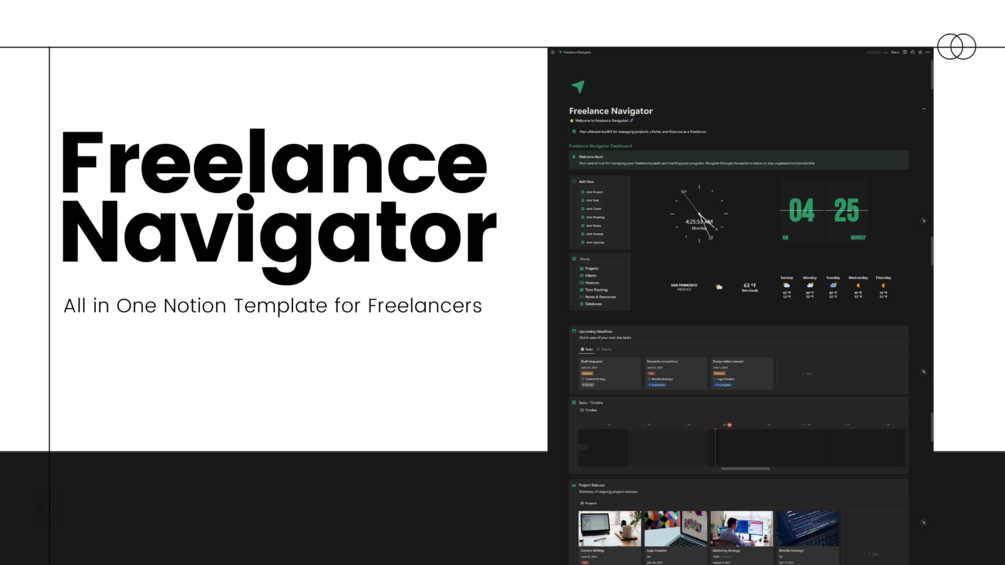Navigating the complexities of freelancing can be challenging. With Freelance Navigator, you’ll have a robust, all-in-one solution designed to simplify your daily operations, enhance productivity, and keep you organized. This powerful Notion template provides a seamless way to manage projects, track time, handle finances, and maintain client relationships.